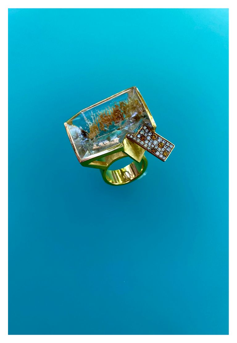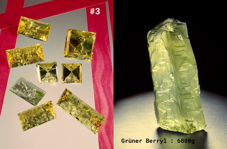 Ein reiner Beryll von ursprünglich vier Kilogramm, unbeschädigt und ohne Einschlüsse, gefunden in einer Mine in Wolodarsk, die nun keine Edelsteine mehr fördert. Die großen, bewegten Strukturen des Beryll gegenüber den feinen, geometrisch geschliffenen Brillanten stehen im Gleichgewicht. Zugleich ein Wunder der Natur: Pyramiden und Vertiefungen haben sich vor Urzeiten in diesem Kristall gebildet und sind durch das Schleifen an die Oberfläche befördert worden. Diese schneiden sich, überlagern sich mit dem Funkeln der Brillanten oder stehen für sich als komplexe, geometrische Formen. Meiner Ansicht nach ein einmaliger Höhepunkt. An Material und Bearbeitung, an Zusammenspiel aus Goldschmiede- und die Edelsteinschleifkunst und an Glück, einen solch außergewöhnlichen Beryll gefunden zu haben.