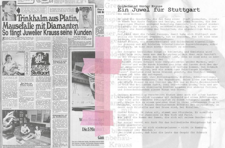 Krauss gewann damals schon seinen ersten von mittlerweile drei Diamond International Awards und zwei Mal in Folge den Preis der Stadt Genf, Auszeichnungen, zu denen mittlerweile die Benvenuto Cellini-Medaille in Gold, die Goldene Muschel für das Juwel des Jahres, drei Mal die Goldene Lupe, ein erster Preis für Platin als Schmuckmetall, drei Preise für die Gestaltung von Diamanten Heute und die Aufnahme in die Diamonds International Academy dazu gekommen sind. Krauss arbeitete in der Gruppe „Art Design“ frei für Juweliere in Paris und New York, erwarb sich einen internationalen Ruf und zählte das holländische Königshaus zu seiner Klientel. Es kann durchaus vorkommen, dass man einem Schmuckstück von Günter Krauss an einer Dame in Rom, Paris oder New York begegnet. Und man wird es sofort erkennen.