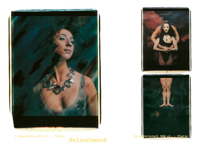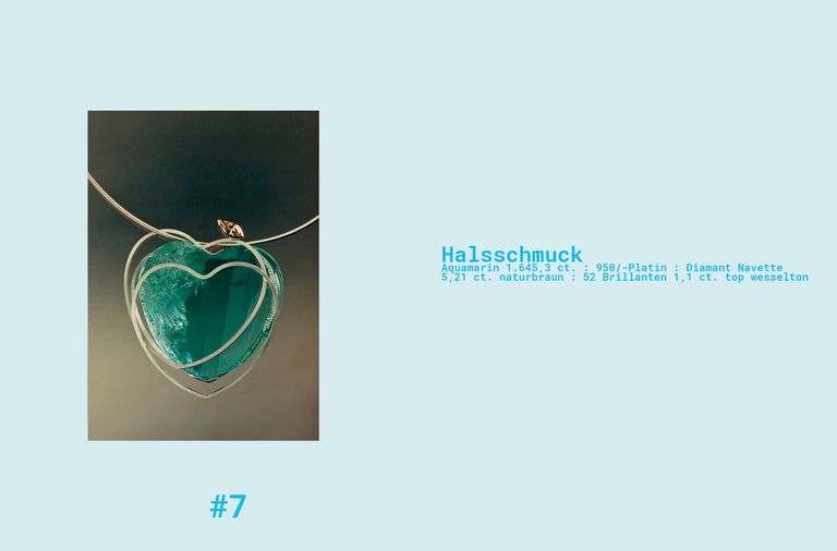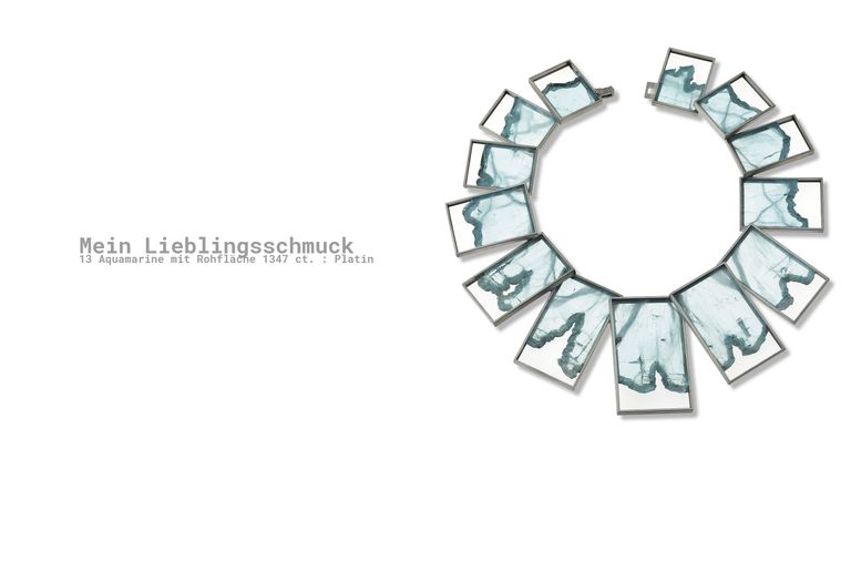 Hier wollte ich die gegenseitige Beeinflussung von Gestaltung und gewachsenen Formen betonen: In diesem Blattcollier sind 9 Aquamarine in grünlich-blauer Farbe und makelloser Reinheit verarbeitet. Die dazwischen liegenden Blattformen in Platin sind von den Steinformen selbst inspiriert, von diesen übernommen und aus diesen umgesetzt. Das Collier ist in sich vollkommen beweglich, sodass es sich an den Hals der Trägerin oder des Trägers sanft anschmiegt.
