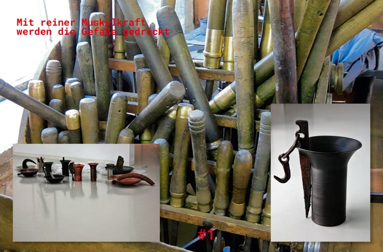 Objekte und ihre Geschichte beginnen nicht erst mit der Erschaffung des Schmuckstückes: Aus einer alten Wagendeichsel wurde dieser Armreif geschmiedet. Was hat dieses Stück Eisen wohl schon alles gesehen und von A nach B bewegt. Fasziniert hat mich hier das feinere, bewegliche Schiffchen welches im Gegensatz zu der derben Fertigung der Deichsel steht. Mit Brillanten besetzt bildet es ein bewegliches Element innerhalb des Armreifs.