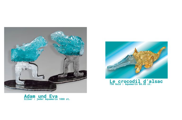 Mystik und Monster. Ein Untier: Minotaurus, der aus einem großen Aquamarin und einer Koralle besteht. Dieser Anhänger ist aus einem über vier Kilogramm schweren Rohstein eines Aquamarins mit stark zerklüfteter Oberfläche entstanden. Die Außenstruktur wurde belassen und in das Schmuckstück integriert: Minotaurus war schließlich auch kein zartes Wesen.