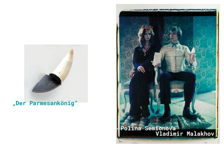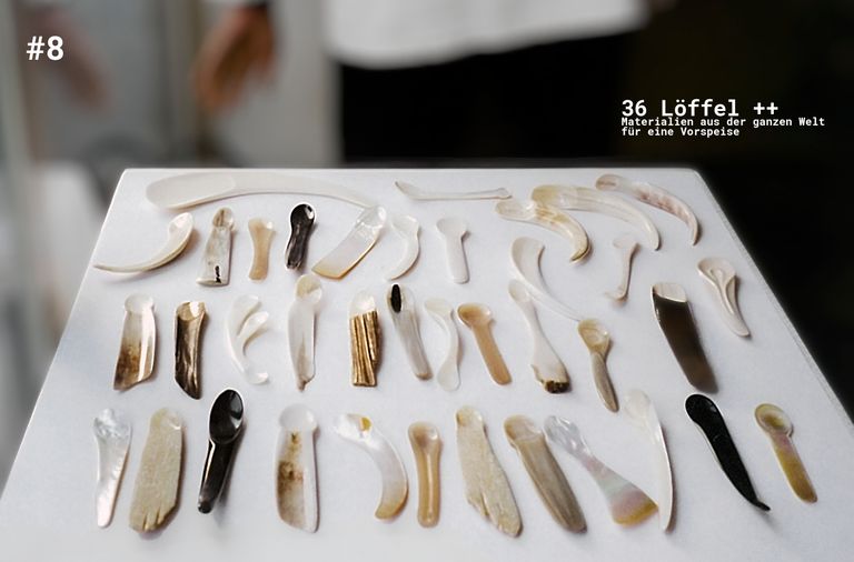 Besondere Speisen betrachte ich gerne als Kunstwerk. Speisewerkzeuge sind hier das Kunstwerk: Die Klingen der drei Messer von 30-40cm aus wunderschönem Damaszenerstahl passen sich dem Schiff, Fisch oder dem Ochsen an. Der Stahl der Klingen selbst ist so gearbeitet, dass er wellenförmig das Schiff trägt, dem Fisch seine gemusterte Haut verleiht oder aber der Maserung von Fleisch gleicht. Die Materialien der Griffe entstammen passend zu den Werkzeugen auch dem Wasser oder dem Land. Auch diese Stücke sind aus der Zusammenarbeit mit R.E Waydelich entstanden.