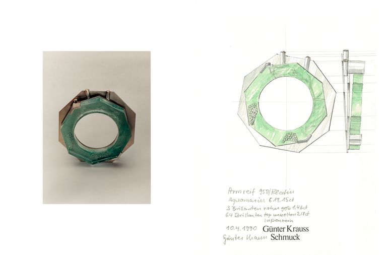Die Schmuckstücke von Günter Krauss, jedes ein Jahrgangs-Unikat, sind Sammlerstücke. Für Kenner, die konsequent vom ersten Tag an bis heute von jeder neuen Kollektion ein Stück kaufen, für Museen, die mit Ankäufen die Bedeutung des Goldschmieds und seiner Kreationen für modernes Schmuckdesign unterstreichen. Zu finden sind Krauss-Kreationen im Kunst- und Gewerbemuseum im norwegischen Trondheim, bei der südafrikanischen Goldminenunion, der De Beers Jewellery Collection, London, im Württembergischen Landesmuseum Stuttgart und selbstverständlich im Schmuckmuseum Pforzheim. Krauss, dem die Metropolen der Welt offen gestanden hätten, ist seiner Heimatstadt Pforzheim treu geblieben. Reicht doch, wenn seine Kreationen in die Welt hinausgehen. Hier entstehen sie in der Werkstatt mit sieben Mitarbeitern. Hier hat er auch sein Refugium mitten im Wald. Ein Ort zum Durchatmen, zur Ruhe Kommen, Kraft Schöpfen: „Ich brauche nicht ständig Trubel.“ Alles Laute verabscheut er wahrscheinlich. Geschwätzigkeit auch. Aufdringlichkeit noch mehr. Das sagt er natürlich nicht. Er ist nur selbst in allem das Gegenteil.